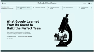 The entire re:Work Google Project Aristotle “What makes a team effective at Google?” is a fantastic resource